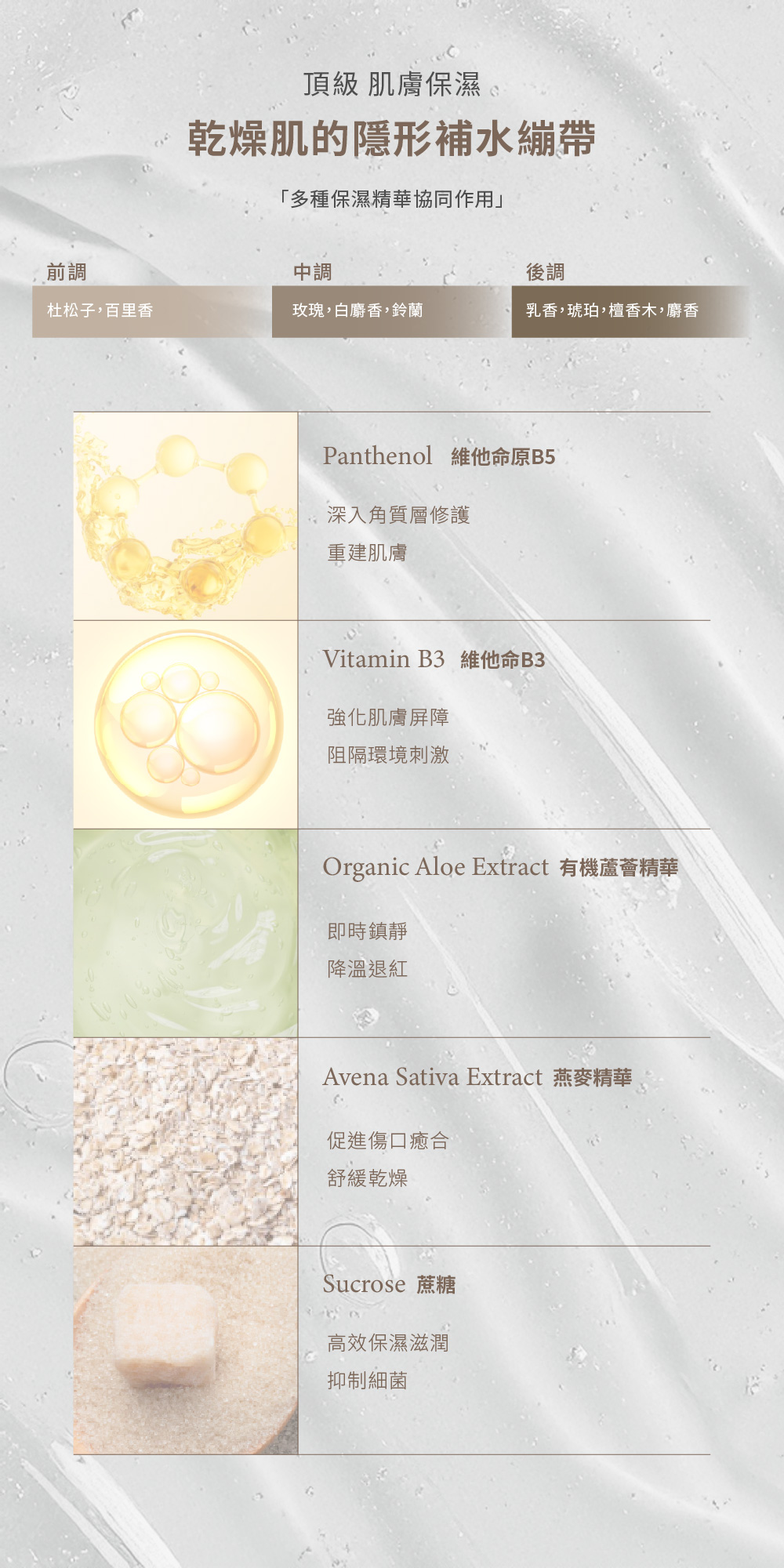維他命B3、維他命原B5、有機蘆薈精華、燕麥精華、蔗糖