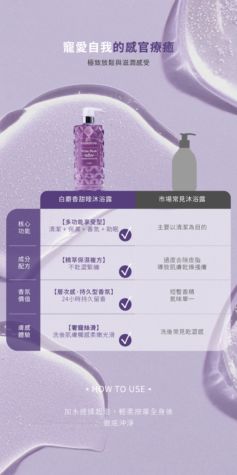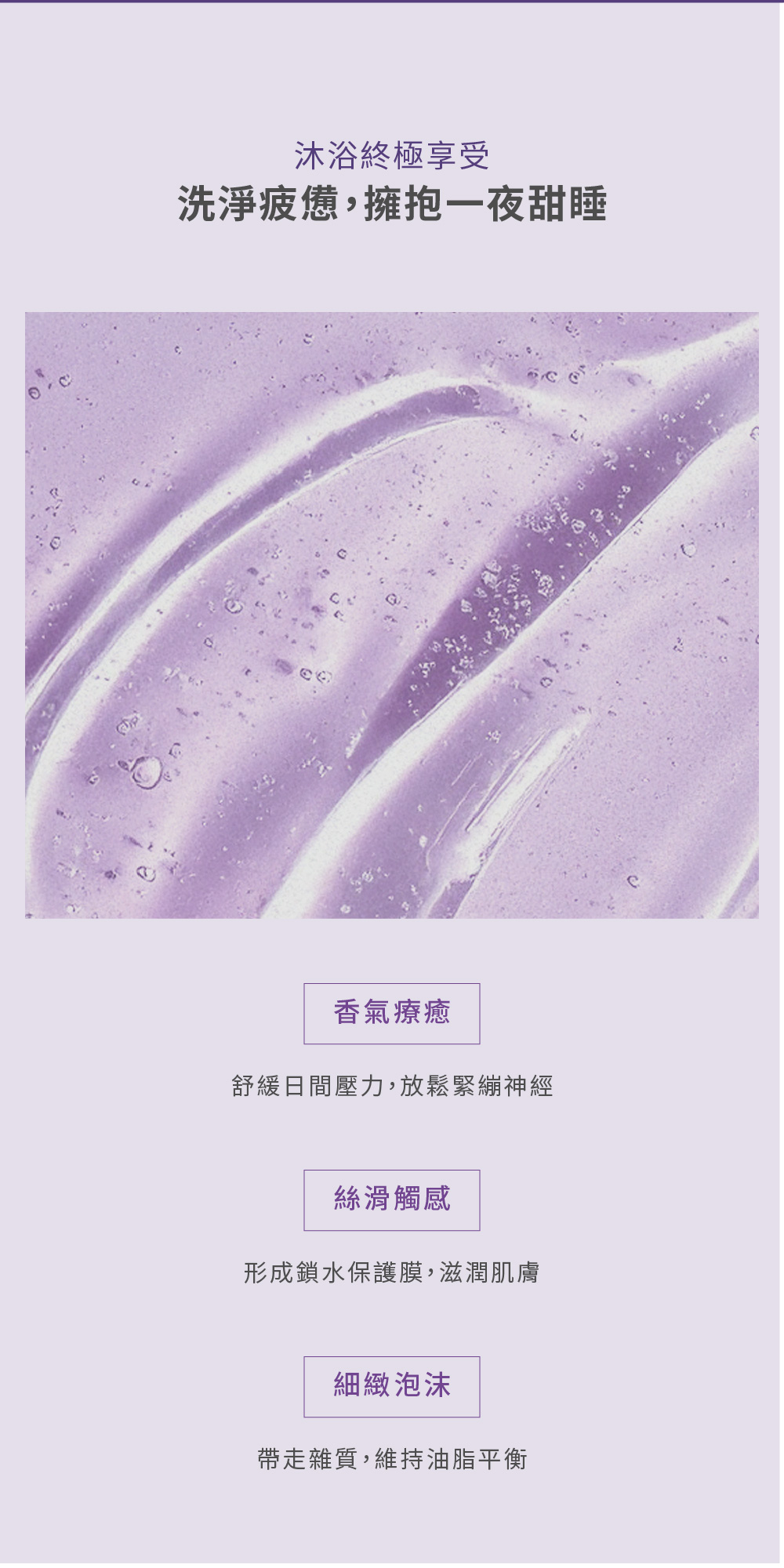 將適量沐浴露倒於沐浴棉或直接塗於身體,加水起泡後塗抹按摩全身,再以清水潔淨。