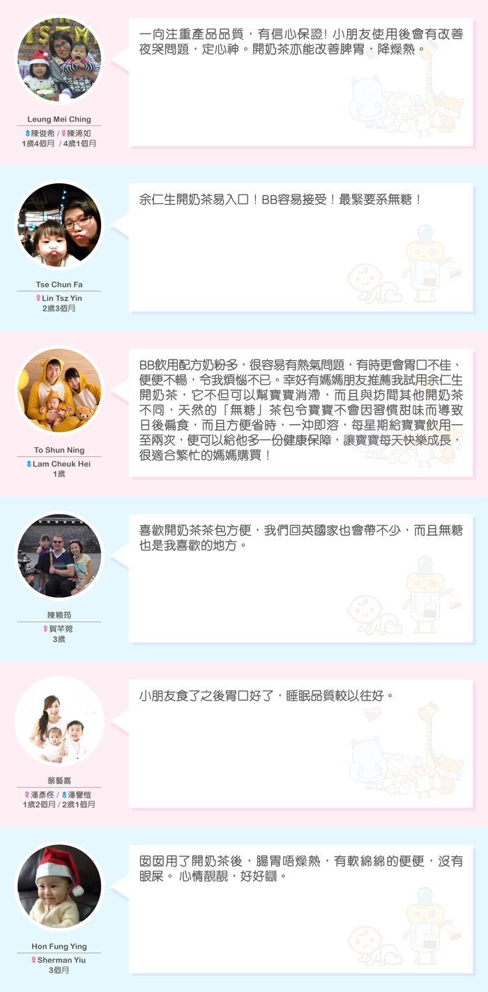 余仁生開奶茶以百份百天然草本成份配以獨特的生產技術製成,並突破常規的開奶茶製備方法,以全港首創的「無糖」茶包面世,100%天然,無添加!對寶寶健康更有保障。每一包余仁生開奶茶含有高濃縮的草本成份,一經浸泡,草本精華快速溶於水中,能達到用量少,快見效的好處。飲用無糖的余仁生開奶茶茶包,可以避免攝入糖份,及不會引起寶寶嗜甜的依賴性。