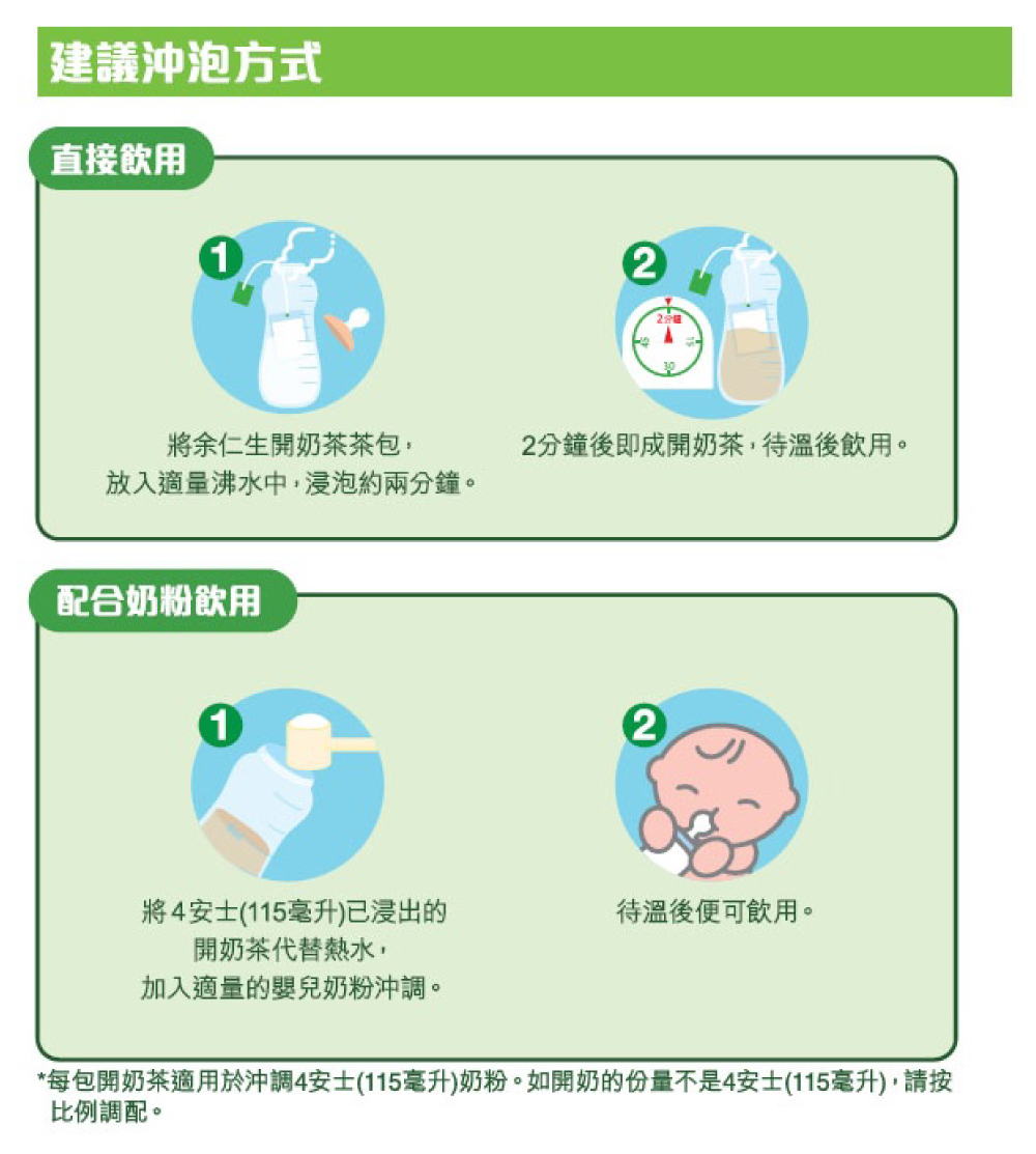 2. 配合奶粉沖調: 把浸泡後濃度適宜之開奶茶混入奶粉後飲用。每包開奶茶適用於沖調4安士(115亳升)奶粉。